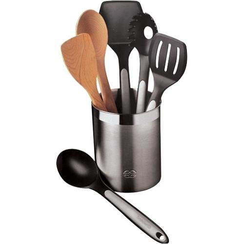 The Calphalon FNS7 7-Piece Mixed Utensil Crock Set combines a variety of useful kitchen utensils in a variety of materials. While all the utensils have grip anywhere handles, the nylon and silicone utensils feature a heat-resistant, soft touch handle for added comfort and control. The utensils fit neatly into the stainless steel crock. This 7-piece set includes a nylon slotted spoon, a nylon slotted turner, a medium wooden spoon, a wooden all-purpose turner, a small silicone scraper, a large silicone scraper, and the stainless steel crock.