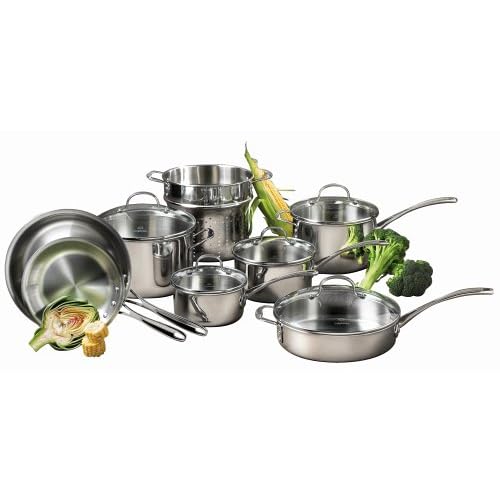 This good-looking 13-piece set has all the components you need to make a variety of scrumptious meals. Combining the beauty of mirror-polished 18/10 stainless steel with the superior performance of highly conductive, heavy-gauge aluminum, the core in this cookware set spreads heat evenly and responds to temperature changes quickly. Cool V handle design ensures handles stay cool on the stovetop. Flared rims protect edges and make pouring easier, neater and safer. Satin finish interior. Set includes 8" and 10" omelette pans, 1.5-quart, 2.5-quart and 4.5-quart sauce pans, 3-quart saute pan, 6-quart stock pot and 6-quart pasta insert. Lifetime warranty.